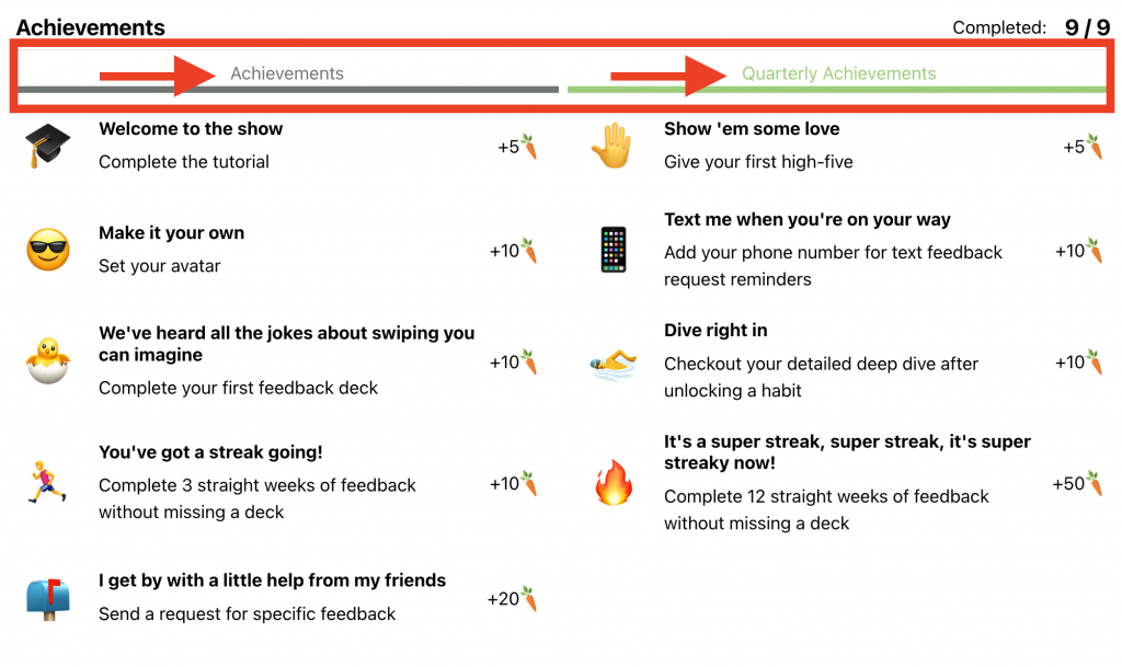 What are the quarterly achievements? Gimme Five! 🤚Give 2 high fives on on the first month of the quarter to earn 10 carrots.