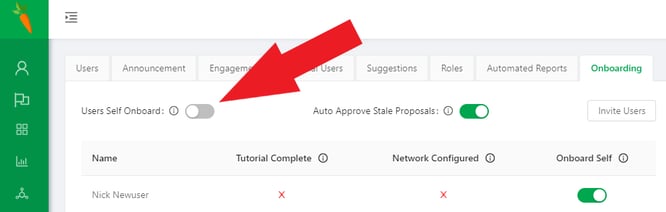 There are two basic ways on how to onboard an employee: Self-Onboarding and Manager Onboarding. Self-Onboarding is used when the new user knows who should be in his or her feedback provider network. This onboarding method is used when an entire company or team is being added to HTS. Once the initial HTS implementation is complete the toggle switch in the top left should be turned off. If you believe that you want to use Self-Onboarding please contact HTS, they will be happy to help.