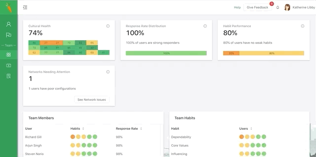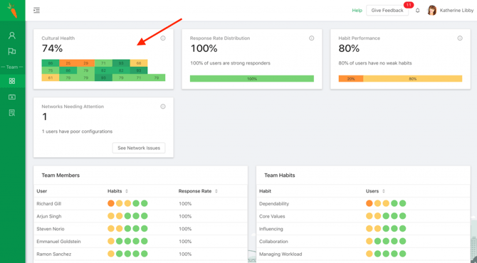 If your team has more than three members you will be able to see the Cultural Health of your team broken down by each habit, your team’s response rate, and Habit Performance. Hover over each block to see the statement your team members provided feedback on.
